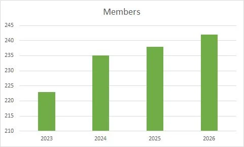Membership continues an upward trend with 11 new members since the start of the year, for a total of 242. This is an eight percent increase since 2023.